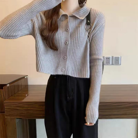 Women Single-Breasted Cardigan Sweater Stripe Polo Neck Long Sleeve Knit Sweater Solid Casual Sweater for Women Autumn Winter