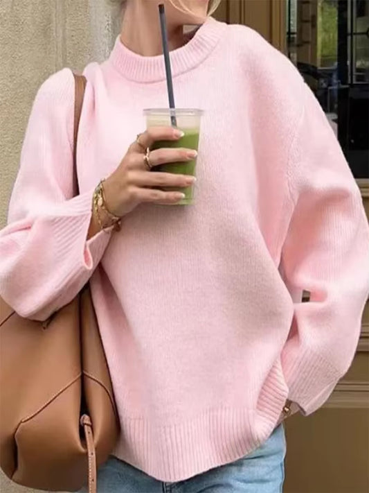 Women'S Autumn Winter Knit Sweater Casual Loose Long Sleeve O Neck Solid Color Knitwear Female Fall Knitted Pullovers Tops Daily