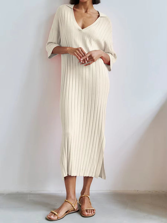 Women Long Dress, Elegant Half Sleeve V Neck Solid Loose Slit Dress Summer Knit Dress